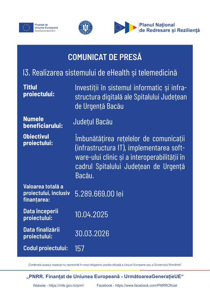 • Investiții în sistemul informatic și infrastructura digitală ale Spitalului Județean de Urgență Bacău